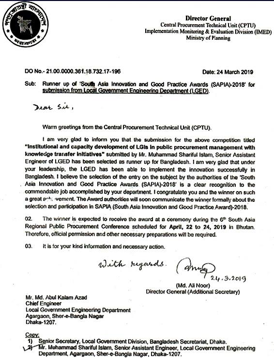 এলজিইডি-র সিনিয়র সহকারী প্রকৌশলী জনাব মুহাম্মদ শরিফুল ইসলাম "সাউথ এশিয়া ইনোভেশন অ্যান্ড গুড প্র্যাকটিস অ্যাওয়ার্ডস (এসএপিআইএ)-2018"-এ বাংলাদেশের জন্য রানার আপ নির্বাচিত হয়েছেন যার নাম "জ্ঞানের সাথে পাবলিক প্রকিউরমেন্ট ম্যানেজমেন্টে এলজিআই-এর প্রাতিষ্ঠানিক ও সক্ষমতা উন্নয়ন"। স্থানান্তরের উদ্যোগ"।